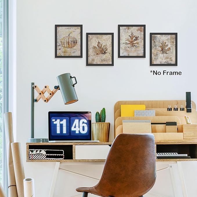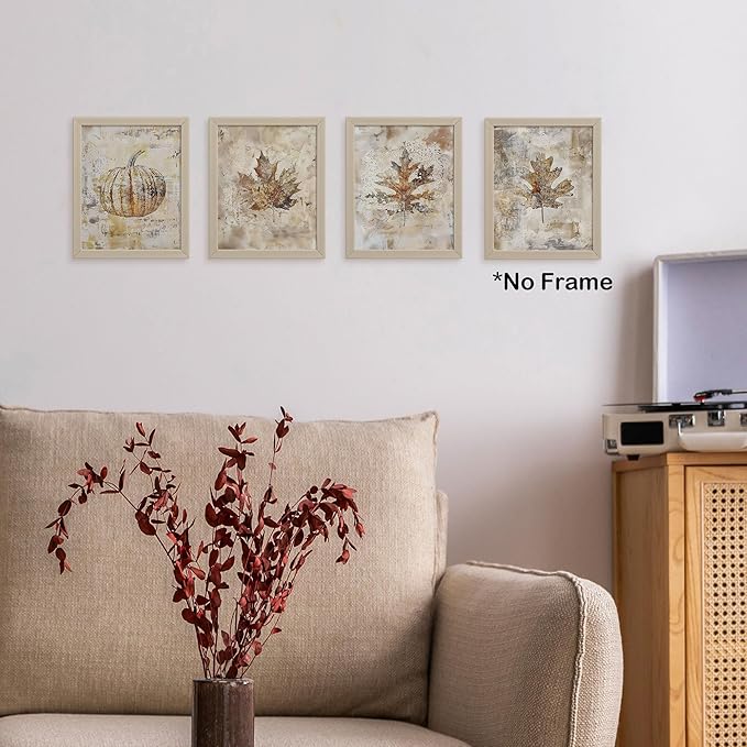 TLESKE Vintage Fall Leaves Pumpkin Posters Prints Unframed 8x10 Set of 4, Autumn Rutsic Maple Oak Leaf Wall Art Prints Decor for Farmhouse Bedroom Living Room, Thanksgiving Wall Pictures