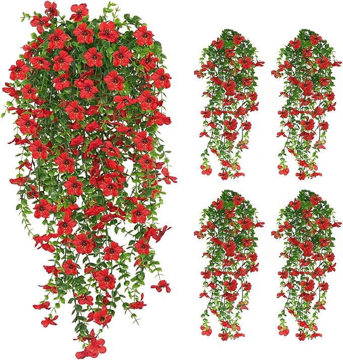 4 Pcs Fall Artificial Hanging Flowers for Outdoors,Fake Hanging Plants,Artificial Mums for Outdoors,Fall Decorations for Home,Outdoor Fall Decor(Red)