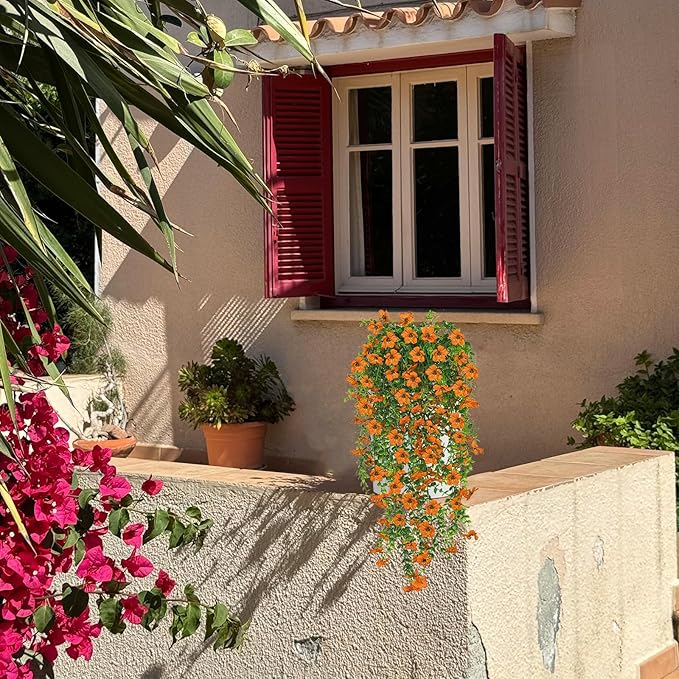 4 Pcs Fall Artificial Hanging Flowers for Outdoors,Fake Hanging Plants,Artificial Mums for Outdoors,Fall Decorations for Home,Outdoor Fall Decor(Orange)