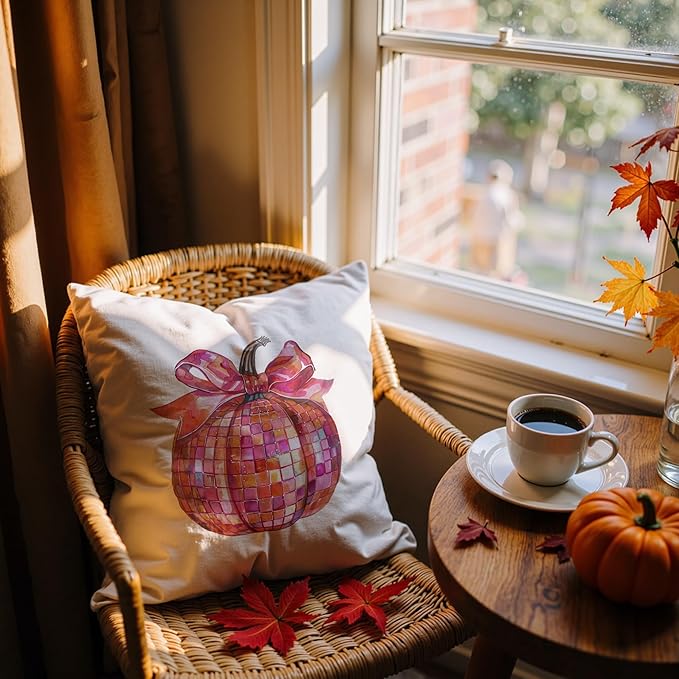 Coquette Pink Bow Disco Ball Pumpkin Fall Pillow Covers 18x18, Preppy Fall Decor, Funky Y2K Girly Pumpkin Autumn Decorative Throw Pillow Covers for Girls Room Dorm Home Bedroom Living Room