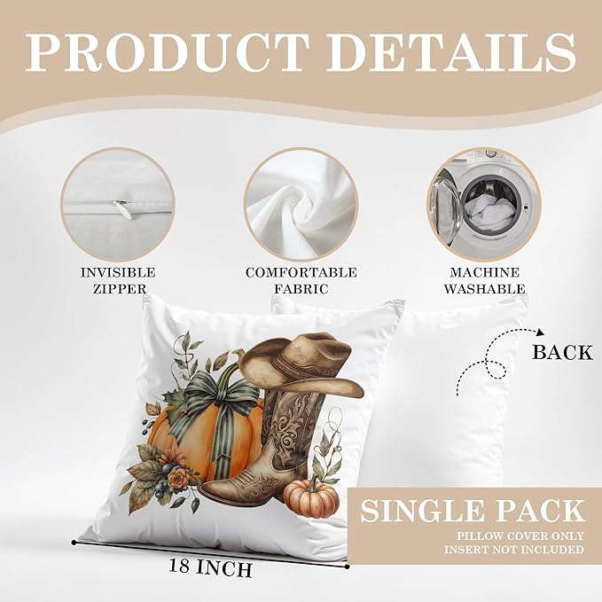 Boho Fall Western Pillow Covers 18x18, Western Fall Decor, Coquette Bow Autumn Pumpkin Country Cowgirl Boot Hat Decorative Throw Pillow Covers for Girls Room Home Bedroom Living Room