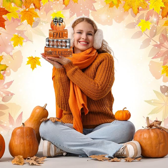 - Comprehensive Packaging: this package comes with 1 grid pumpkin wooden sign with a bow and 3 faux stacked books, offering you multiple elements to employ in your decorating adventures; Stacked books are printed with [thankful blessed], nice addition to your fall decor
