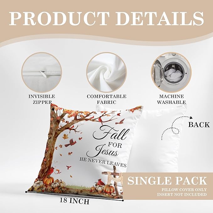 Fall for Jesus He Never Leaves Christian Throw Pillow Covers 18x18, Autumn Pumpkin Leaf Pillow Case Decor for Bedroom Home, Fall Christian Religious Gifts for Women
