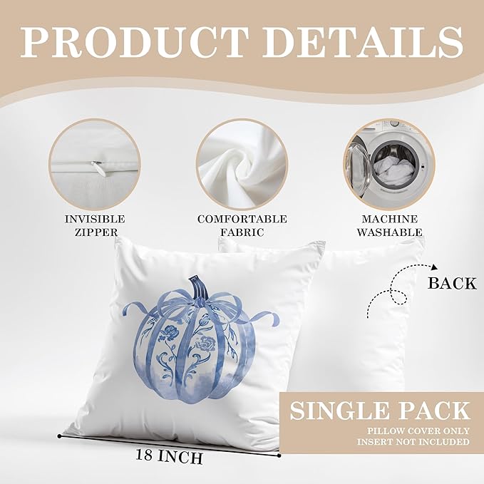 Blue Chinoiserie Pumpkin Fall Pillow Covers 18x18, Preppy Fall Decor, Grandmillennial Blue and White Floral Pumpkin Autumn Decorative Throw Pillow Covers for Girls Room Home Bedroom Living Room