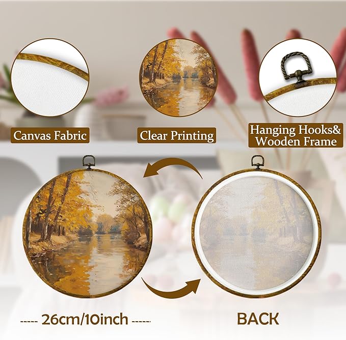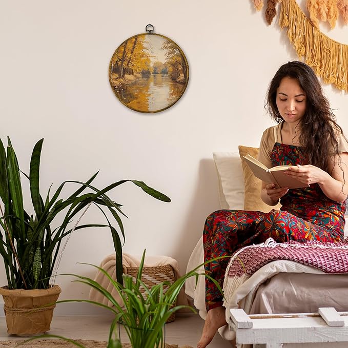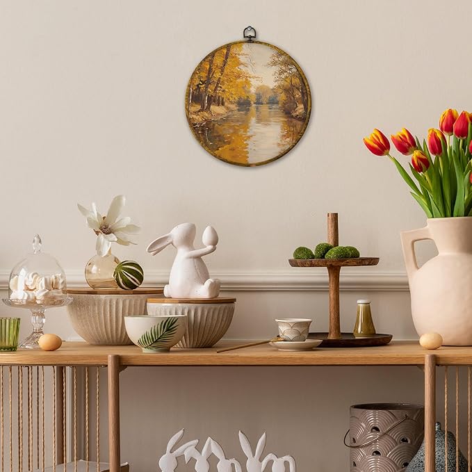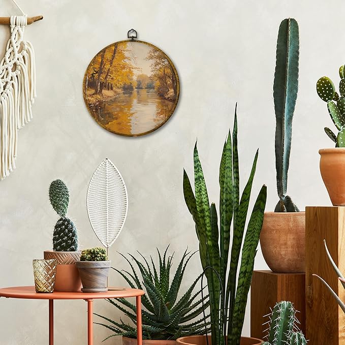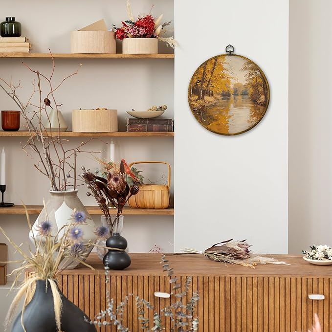 Mcehtle Vintage Fall Wall Art Decor, Rustic Nature Autumn Tree Landscape Framed Canvas Prints 10x10, Farmhouse Fall Seasonal Round Wall Hanging Artwork Decorations for Bedroom Living Room Home
