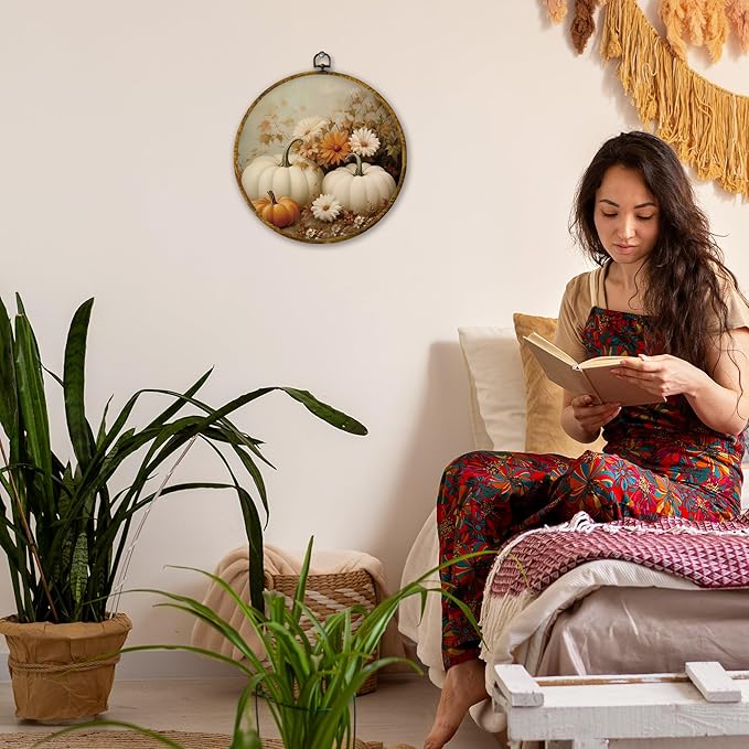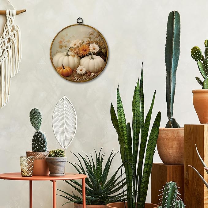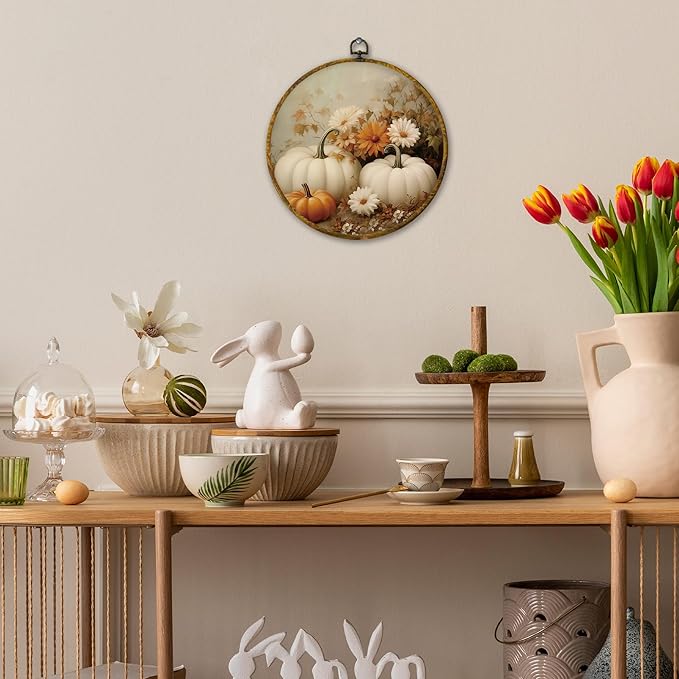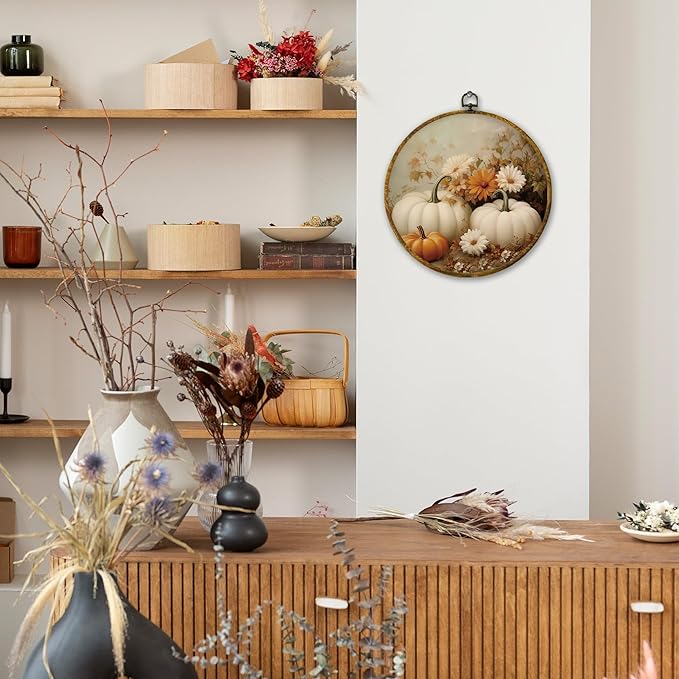 Mcehtle Vintage Fall Pumpkin Wall Art Decor, Retro Autumn Harvest White Pumpkin Floral Framed Canvas Prints 10x10, Rustic Farmhouse Round Wall Hanging Artwork Decorations for Bedroom Living Room Home