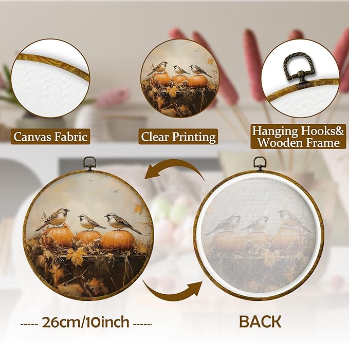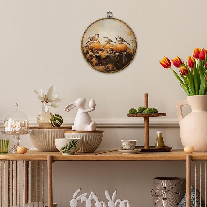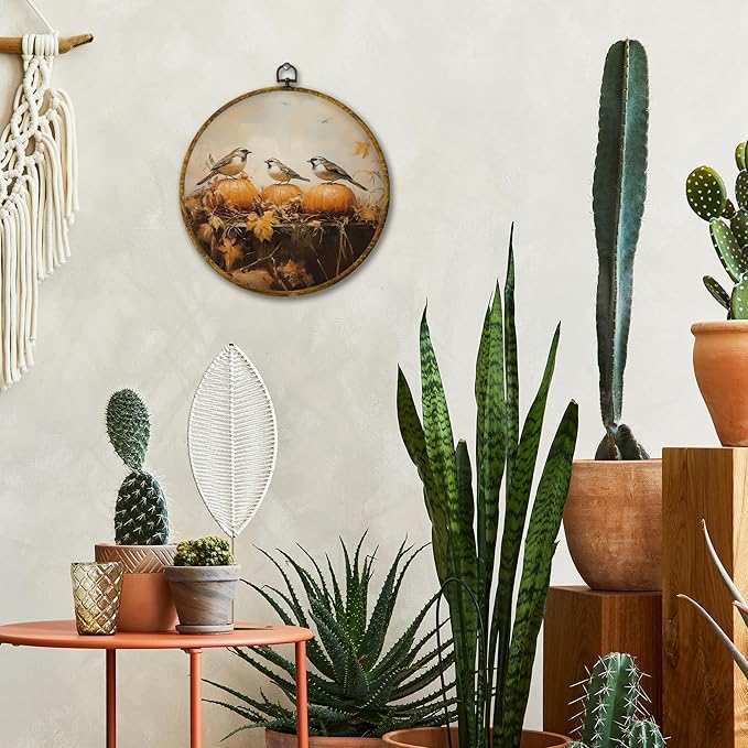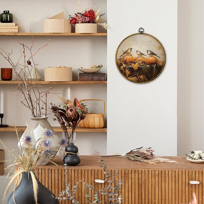 Mcehtle Rustic Fall Bird Pumpkin Wall Art Decor, Autumn Maple Leaf Sparrow Bird Framed Canvas Prints 10x10, Thanksgiving Halloween Farmhouse Round Wall Hanging Artwork Decorations for Home Bedroom