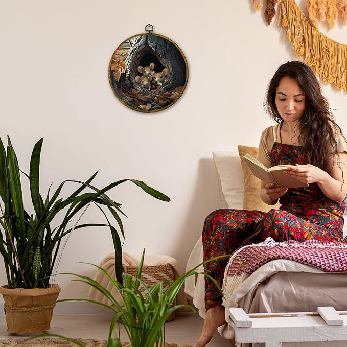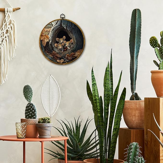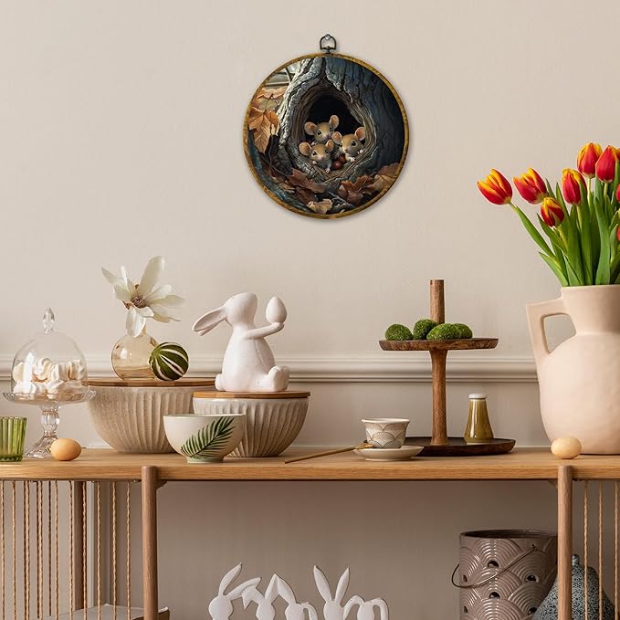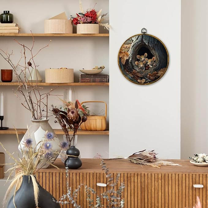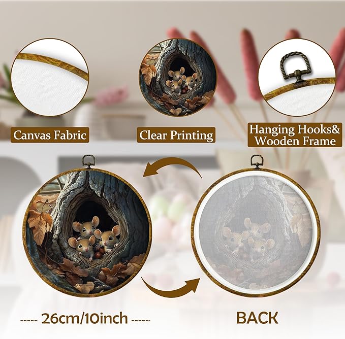 Mcehtle Fall Rat Wall Art Decor, Retro Cottagecore Autumn Mouse Maple Leaf Framed Canvas Prints 10x10, Rustic Country Animal Farmhouse Round Wall Hanging Artwork Decorations for Bedroom Living Room