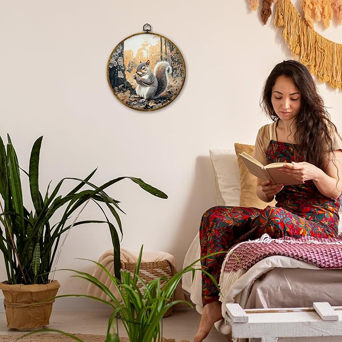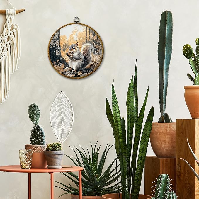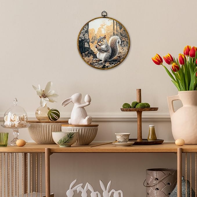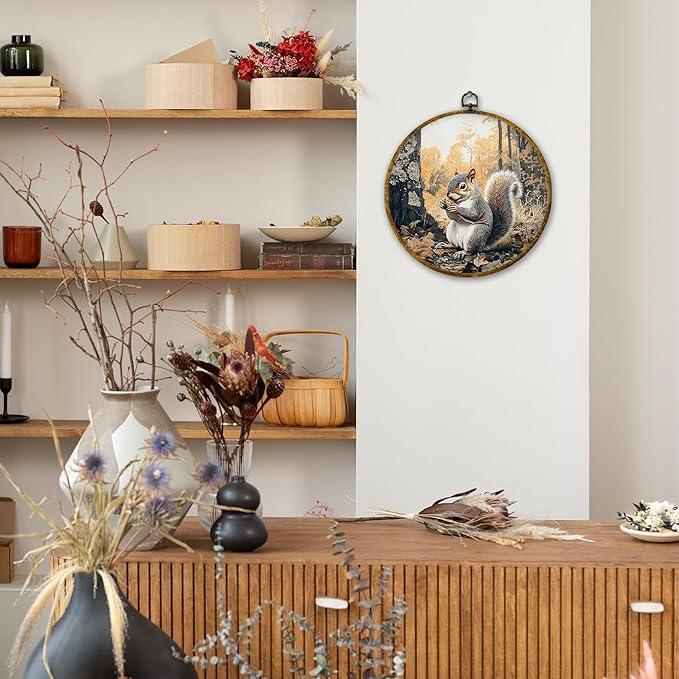 Mcehtle Vintage Fall Squirrel Wall Art Decor, Rustic Autumn Nature Forest Squirrel Framed Canvas Prints 10x10, Fall Wild Animal Farmhouse Round Wall Hanging Artwork Decorations for Home Bedroom