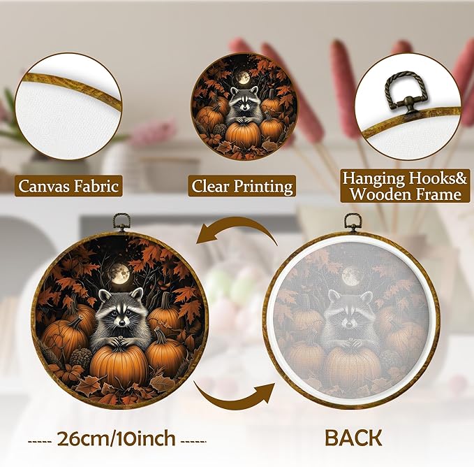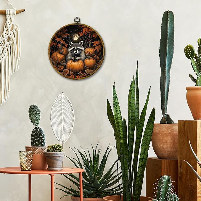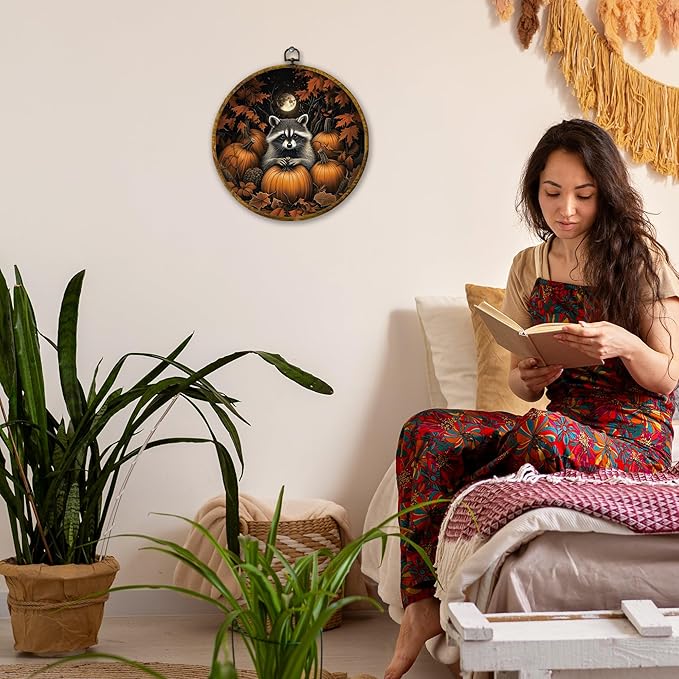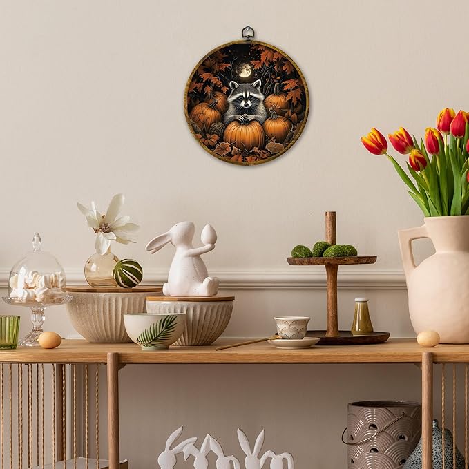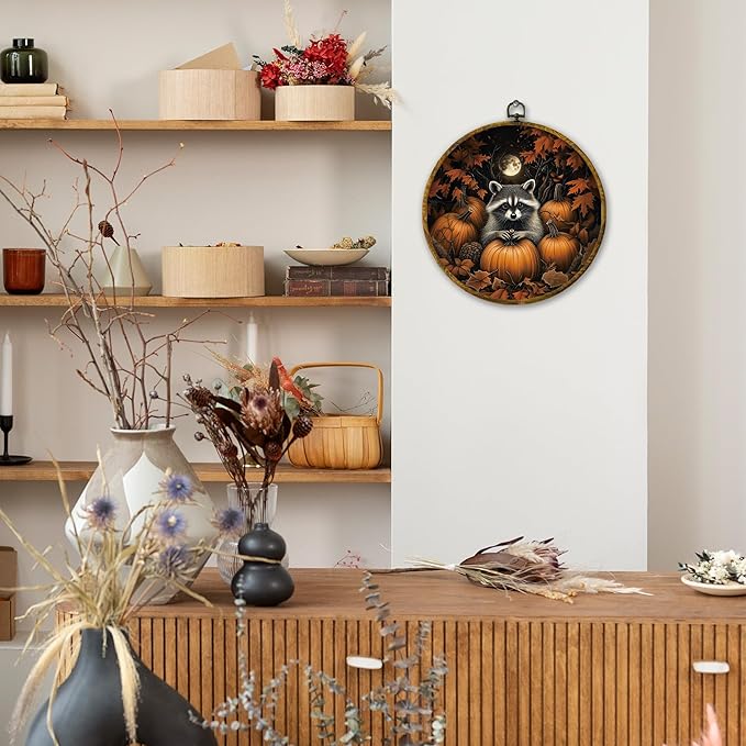 Mcehtle Moody Fall Raccoon and Pumpkins Wall Art Decor, Vintage Autumn Nature Cozy Fall Framed Canvas Prints 10x10, Rustic Woodland Scene Round Wall Hanging Artwork Decorations for Home Living Room