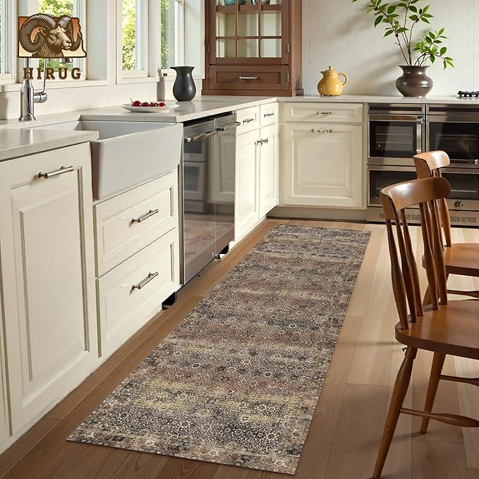 Washable Area Rug 2'6'' x 8' Vintage Traditional Persian Mat - Foldable Distressed Non-Slip Machine Washable Carpet for Living Room Bedroom Kitchen Home Decor - Umber and Slate