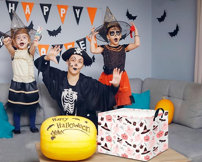 CLOCOR Rectangular Storage Basket Empty, Gift Basket for Halloween, Waterproof Storage Bin with Handles, Room Decor(Pink Bowknot Ghost)
