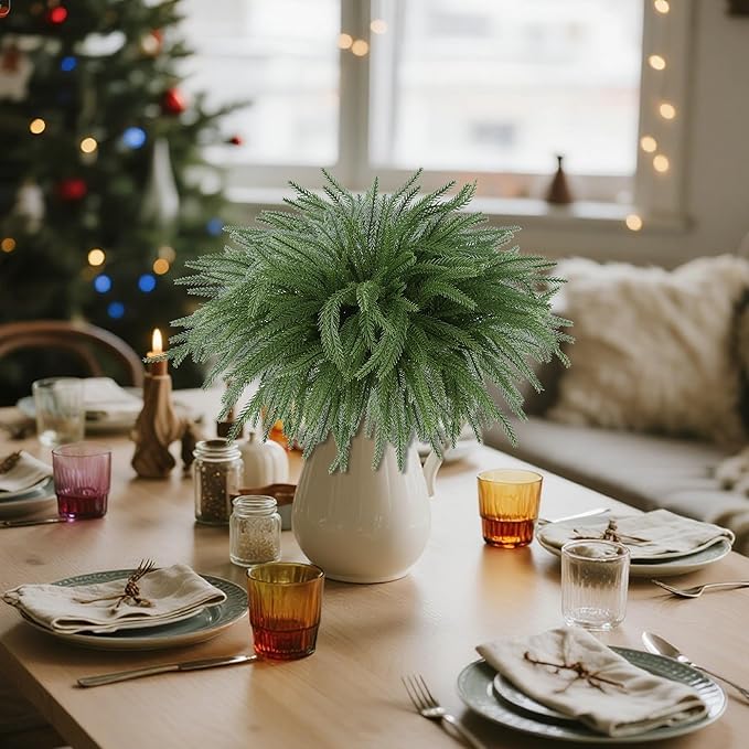 - 12 Pack Realistic Norfolk Pine Greenery: Real-touch technology replicates the look, feel, and flexibility of fresh pine stems—ideal for Christmas floral arrangements, holiday planters, or as Christmas tree filler branches in your festive decor. With a bulk set of 12 stems, you have ample holiday garland material and evergreen sprigs to decorate mantels, tabletops, doorways, and entryways.