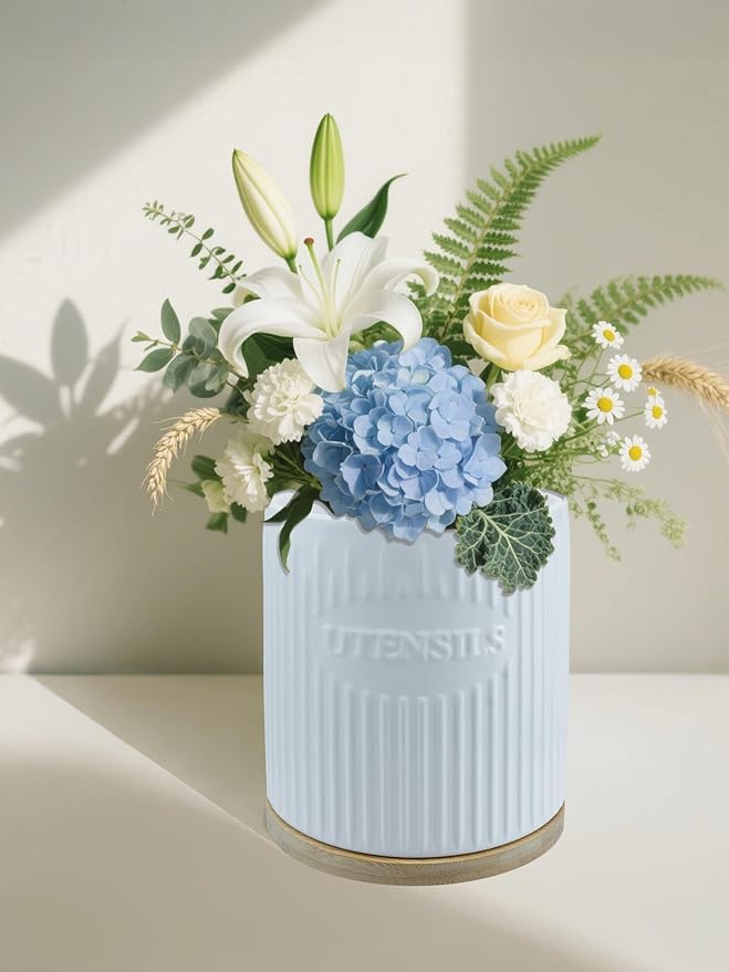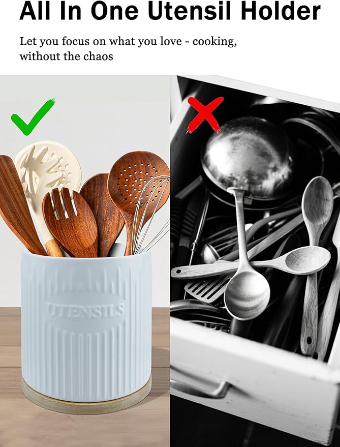 - Safe & Stable Material: Made from high quality ceramic, there is no plastic, cadmium or lead to worry about harmful substances leaking into your food. Our utensil crock boasts excellent stability, featuring a weighted bottom made from durable, removable bamboo that prevents tipping and ensures your utensils are stored safely during everyday use.