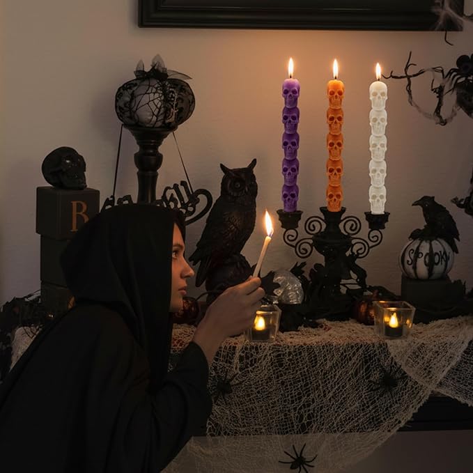 - Complete Halloween Candle Set: includes 12 skull taper candles in 4 assorted colors (3 of each), providing enough supply for your Halloween dinner parties, festive decorations, and seasonal celebrations