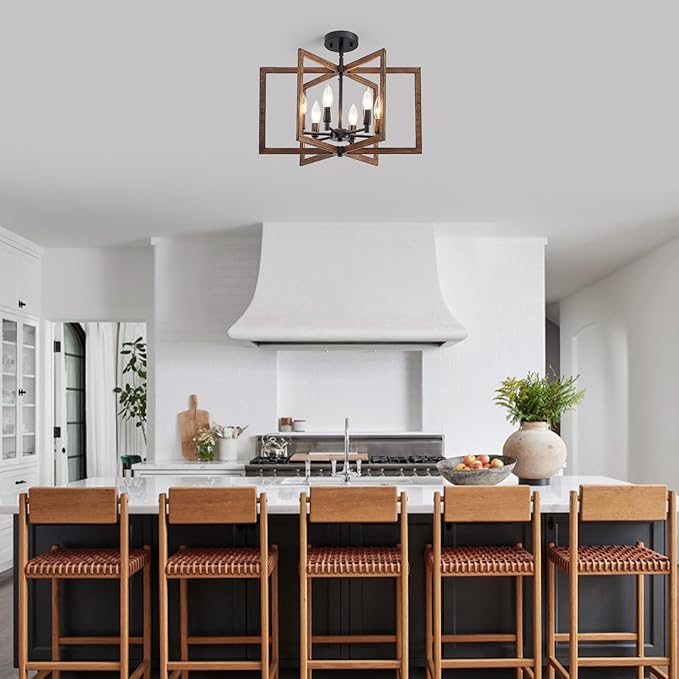 Modern Farmhouse Chandelier 20'' Black and Wood Grain 6-Light Pendant Lighting Fixture for Dining Living Room Kitchen Entryway, Geometric Metal Vintage Adjustable Hanging Chandelier Lamp