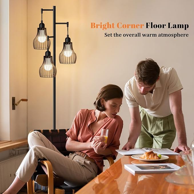 Dimmable Floor Lamps for Living Room, Farmhouse Tree Standing Tall Lamp with Remote Control 3 Elegant Cage Shade LED Bulbs for Bedroom Office - Black