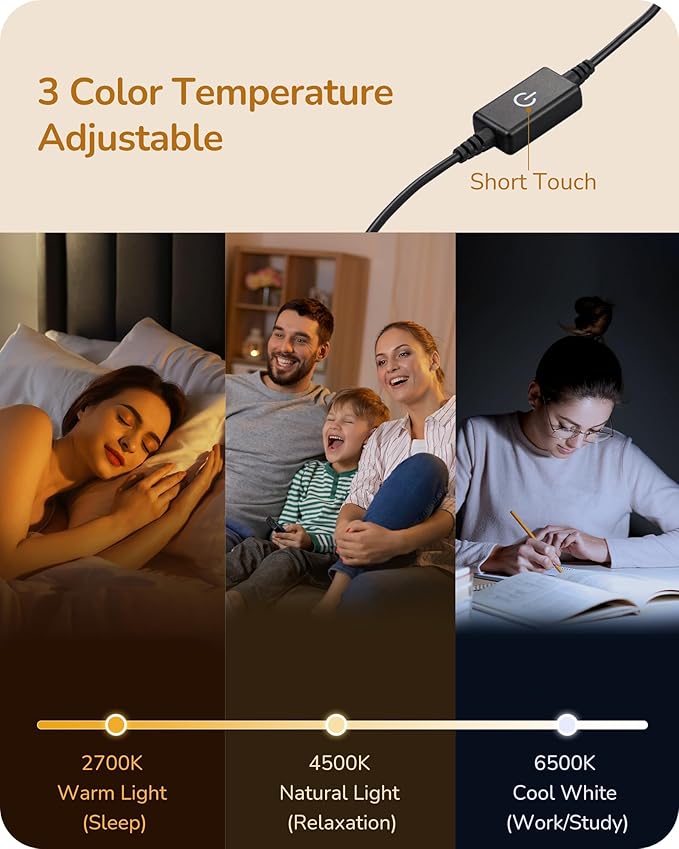 - [3 Color Temperatures & Stepless Dimming] Choose from 2700K, 4500K, and 6500K color temperatures and adjust brightness smoothly (Max. 550LM) to fit any setting; this side desk lamp is ideal for home offices, bedrooms, and living rooms