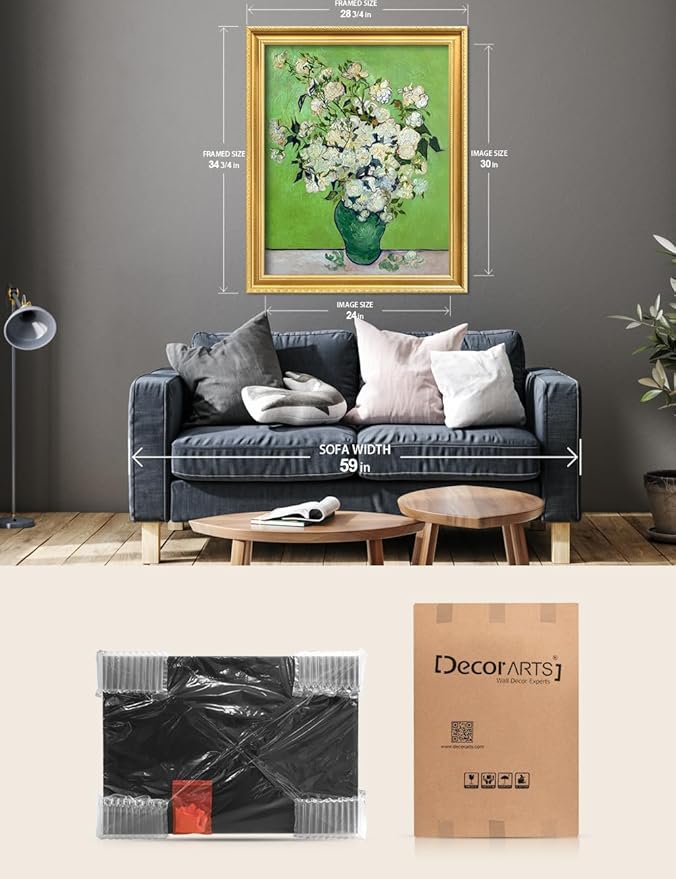 DECORARTS - Vincent van Gogh's Pink Roses in a Vase, Museum-Quality Giclee Canvas Print in Gold Solid Wood Frame, 34.75 x 28.75 in, Ready to Hang, Made in USA