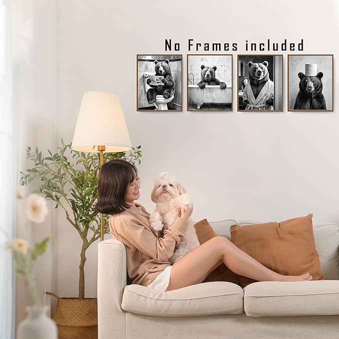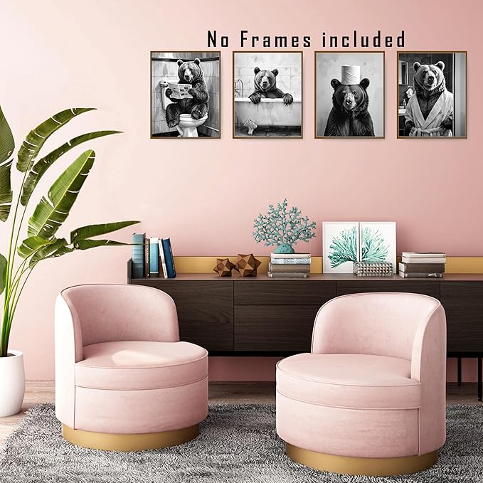 FITIE Funny Black Bear Bathroom Wall Art Posters Set of 4, Bear Bathroom Decor, Humorous Wild Animal Bathing Toilet Canvas Prints Artwork Wall Decor for Bath Room Washroom, 8x10 Unframed