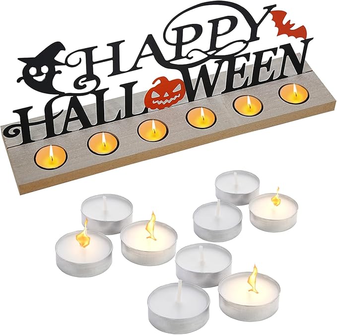 - Happy Halloween Decorations: The package includes a colorful metal Happy Halloween sign, a wooden base and 18 pcs tealights. You will need to insert a metal sign into the wooden base, which will stand firmly and reliably, put in the tea candles, adding eye catching colors to your home