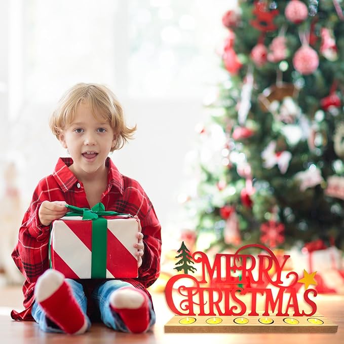 - Merry Christmas Decorations: The package includes a colorful metal Merry Christmas sign, a wooden base and 18 pcs tealights. You will need to insert a metal sign into the wooden base, which will stand firmly and reliably, put in the tea candles, adding eye catching colors to your home