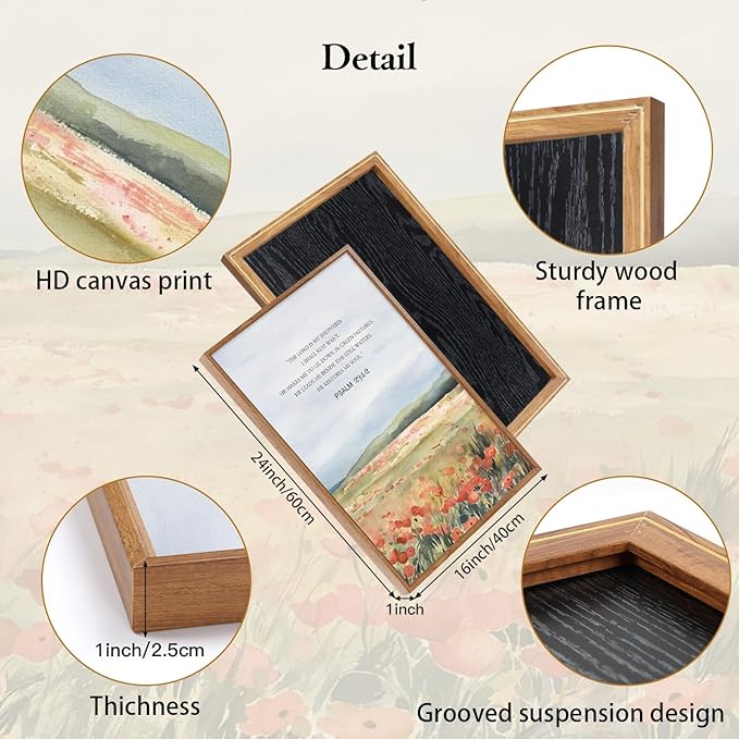 - FLORAL BIBLICAL WALL ART: These decorative canvas prints showcase sea of floral landscapes paired with inspiring biblical verses. The vibrant colors and peaceful scenery create a spiritual and uplifting aesthetic that complements any decor style.