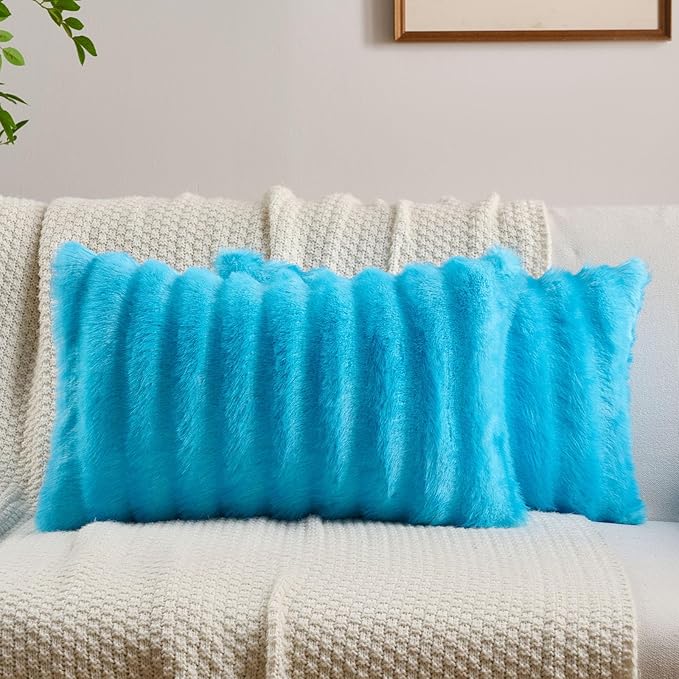 FUTEI Sky Blue Decorative Throw Pillow Covers 12x20 Inch Set of 2,Soft Fluffy Faux Mink Fur Dyeing Striped Textured Lumbar Pillow Case,Modern Home Decor for Couch Bed Living Room