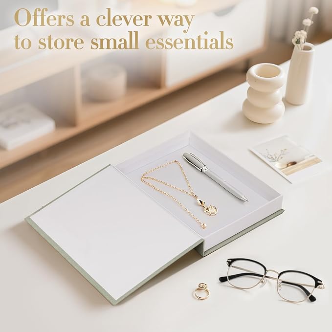 - Elegant & Versatile Faux Book Storage Box: Crafted from high-quality linen with chic sage green and beige tones, this modern decorative book box features delicate gold foil lettering. Perfect as coffee table decor books, or hidden storage for home decor in the living room, entryway, bedside, or bookshelf—adding both style and function to any space.