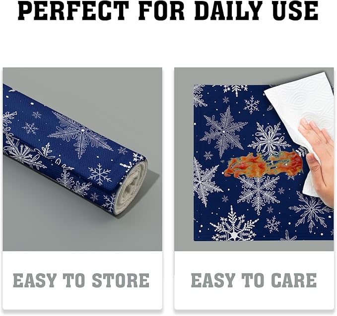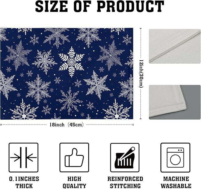 - High Quality: The winter placemats are made of high quality fabric, thick and wrinkle-proof, withstand frequent use and washing. It will protect your table surface from hot pans, scratches and spills.