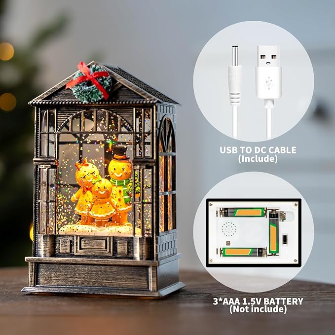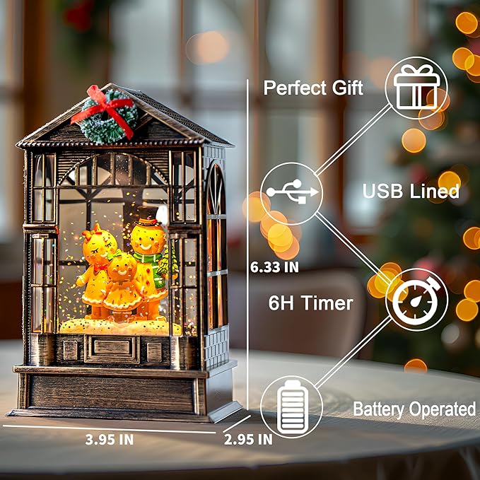 Christmas Snow Globe, Lighted Gingerbread Man Family Scene, Musical Snow Water Lantern Swirling Glittering Holiday Decoration and Gift for Family Children or Friends