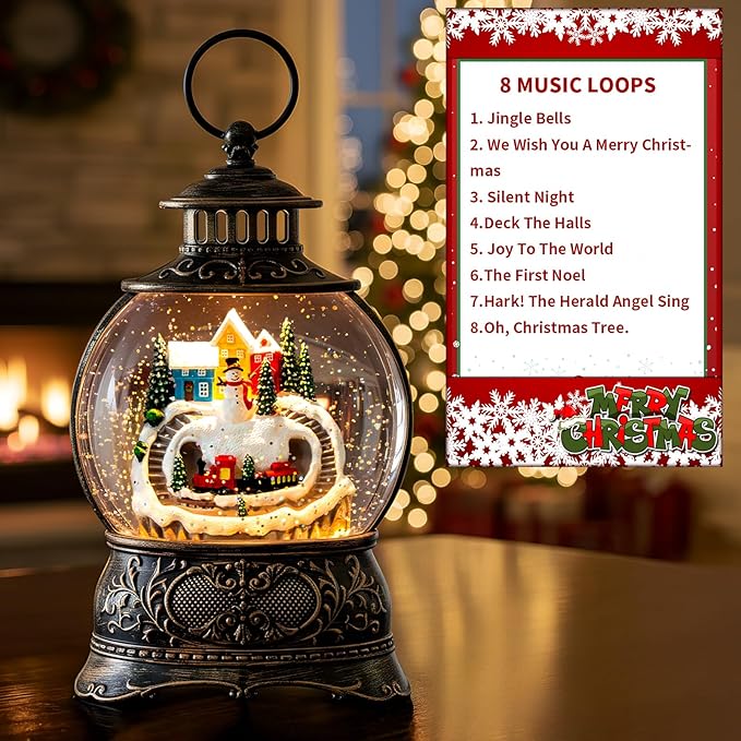 Christmas Village Snow Globe Lantern โ LED Musical Swirling Glitter Water Globe, Snowy Village with Train, Battery or USB Powered, Auto Timer โ Tabletop Decor & Gift