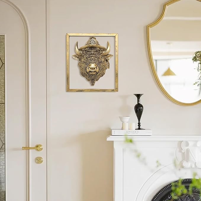 Animal Heads Wall Decor (Includes Metal Frame) Resin Animals Sculptures Head Wall Hanging Decoration Gold vintage Wall Sculpture for Living Room Bedroom Office (American Bison)