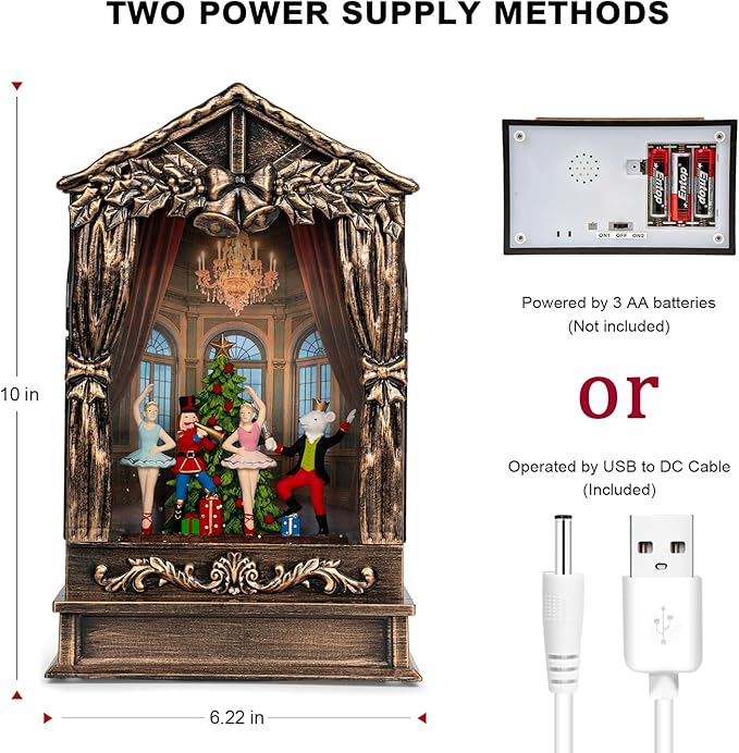 - ๐๐ปใNutcracker Suite SceneใLighted the Sugar Plum Fairy, King Rat, Nutcracker and Clara with a decorated Christmas tree and presents surrounded by swirling glitter Water Lantern Snow globe. When turned on a warm LED shines down on the figurine and swirling glitter to give our water lantern a whimsical look for the Holiday Season.