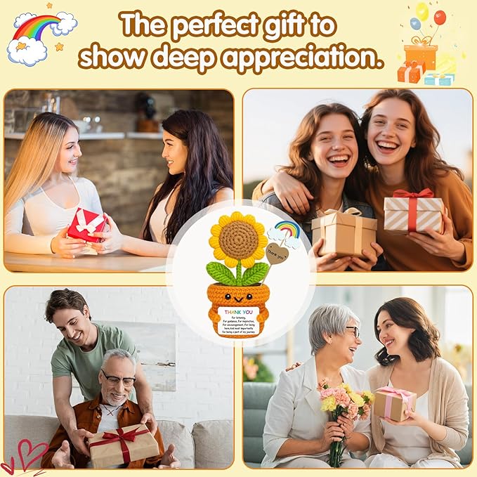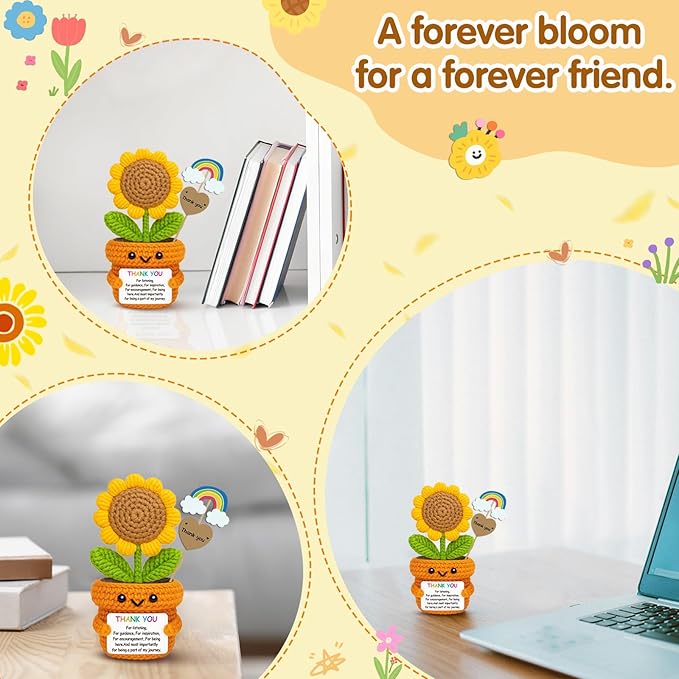 - ✅ Handmade with Positivity & Care Lovingly crocheted from soft yarn, each sunflower doll is one of a kind—just like the amazing people you’re thanking. Its smiling face and positive card offer daily encouragement wherever it’s placed.