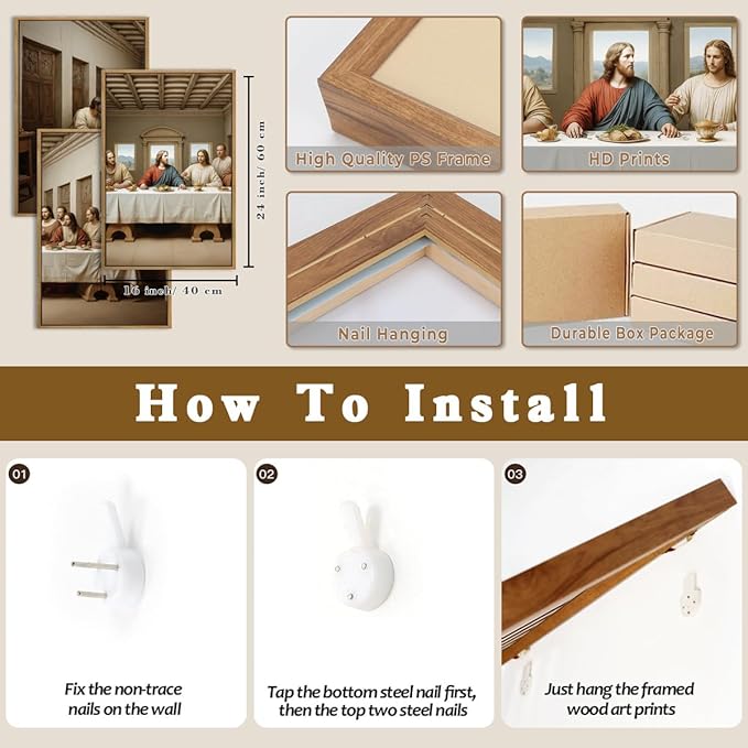 - 【Christian Religious Wall Decor&Premium Quality】Crafted with high resolution printing technology, the details of figures, expressions, and the setting are vividly reproduced. This set of paintings is also equipped with PS frames and solid backboards to ensure that the paintings are not easily damaged during transportation