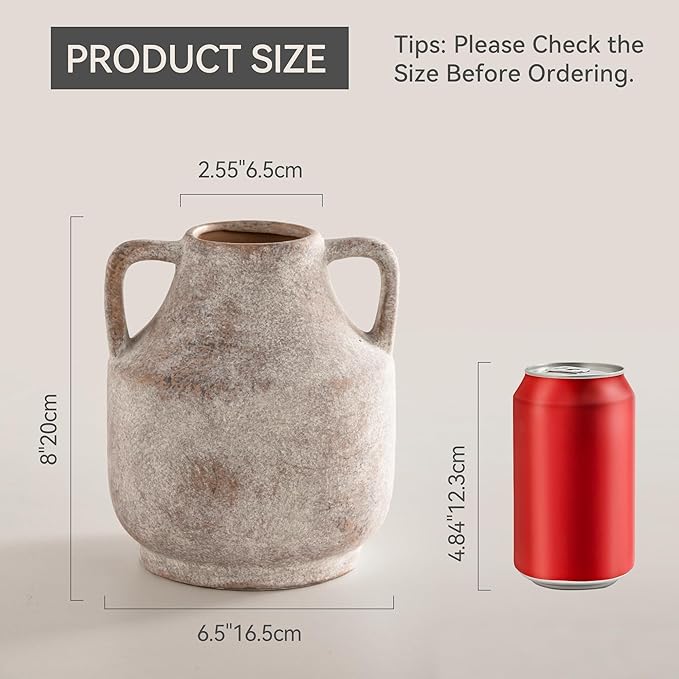 Mitt&Ditt Ceramic Flower Vase with Handles, 8 inch Tall Off-White Vase, Decorative Terracotta Vases, Farmhouse Rustic Pottery Vases for Home Decor, Living Room, Table