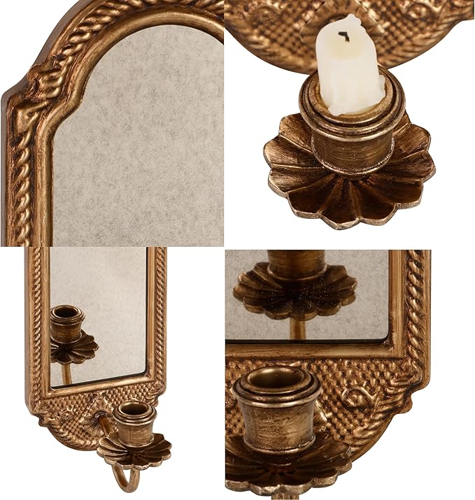SOFFEE DESIGN Vintage Gold Wall-Mounted Candle Sconce with Mirror - Floral Base & 3D Woven Texture for Bathroom, Dining Room, Entryway