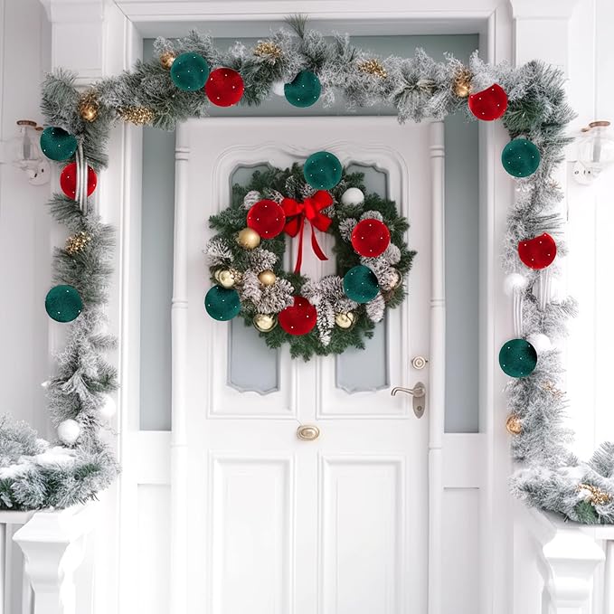Christmas Tree Ornaments Set Velvet Balls, 12pcs Shatterproof Christmas Bulbs Ornaments for Xmas Tree Decorative Hanging, Vintage Flocked Decoration, 78mm, 3.1in, Multicolor Green Red