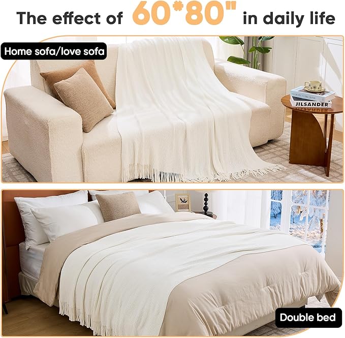 - 【FANTASTICAL COMBINATION】This farmhouse-style knitted throw blanket features a unique knitted stripe pattern and delicate tassels, offering a timeless design perfect for home dcor and holiday styling. As Thanksgiving and Christmas approach, drape this Boho-inspired throw blanket over your dining chairs or table, adding a stylish festive touch. After the celebrations, it’s the ideal cozy companion for resting on your bed, sofa, or couch, bringing ultimate comfort and warmth.