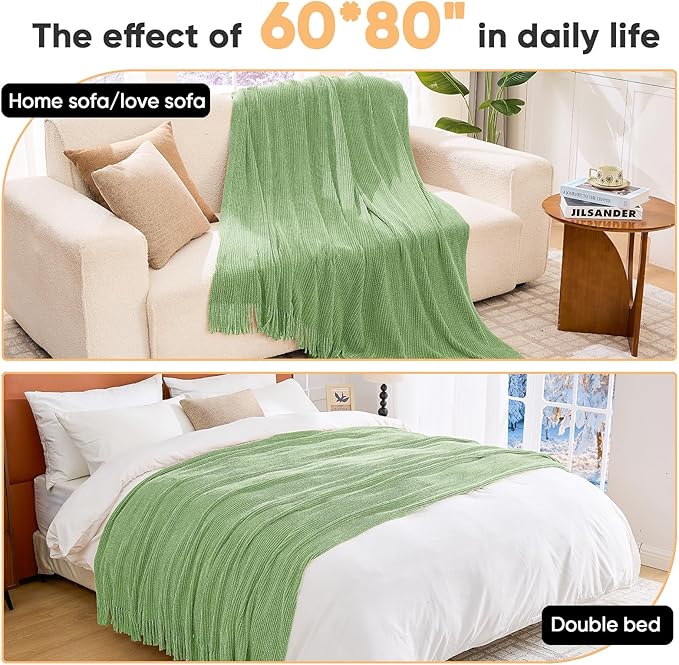 - 【FANTASTICAL COMBINATION】Inspired by minimalist neutral style,this farmhouse knitted throw blanket features a rich Basil color and woven texture,complemented by elegant tassels. It adds cozy Christmas atmosphere to your home or living room.As and Christmas approach, drape this Boho throw blanket over your dining chairs or table,adding a stylish festive touch. After the celebrations,it’s the ideal cozy companion for resting on your bed,sofa, or couch, bringing ultimate comfort and warmth.