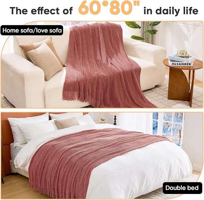 - 【FANTASTICAL COMBINATION】Inspired by minimalist neutral style,this farmhouse knitted throw blanket features a rich Coral Pink color and woven texture,complemented by elegant tassels. It adds cozy Christmas atmosphere to your home or living room.As and Christmas approach, drape this Boho throw blanket over your dining chairs or table,adding a stylish festive touch. After the celebrations,it’s the ideal cozy companion for resting on your bed,sofa, or couch, bringing ultimate comfort and warmth.