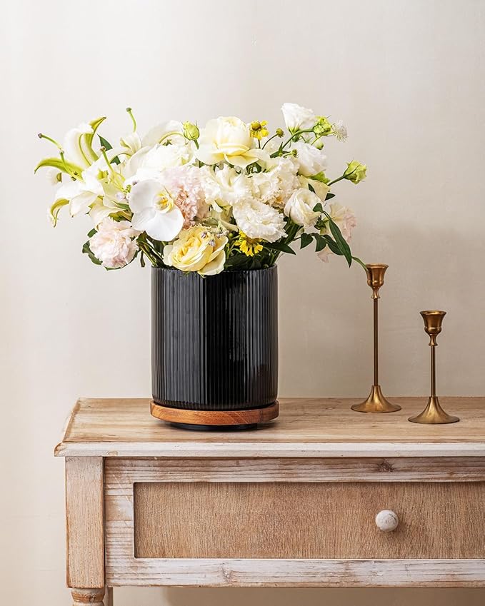 getstar 360° Rotating Large Kitchen Utensil Holder, Ceramic Cooking Utensil Holder for Kitchen Counter with Rotatable and Detachable Wooden Base (Black)
