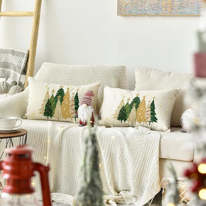 AVOIN colorlife Christmas Trees Star White Throw Pillow Covers Set of 2, 12 x 20 Inch Snowflake Seasonal Winter Holiday Cushion Case Decoration for Sofa Couch