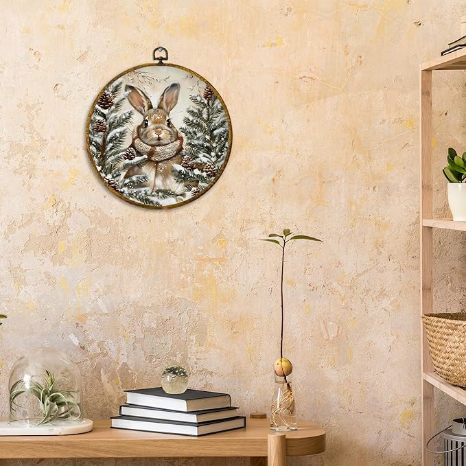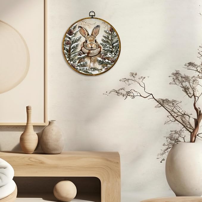 CUANFDDSF Vintage Boho Winter Bunny Round Wall Art Decor, Rustic Cottagecore Rabbit Pinecones Wall Hanging Frame Decor, Farmhouse Winter Bunny Canvas Prints Decorations for Home Bedroom, 10x10 Inch