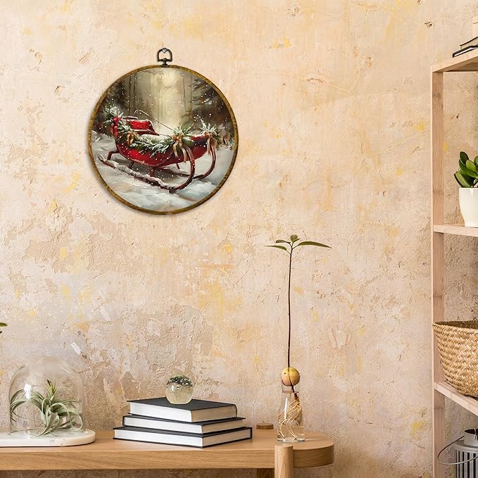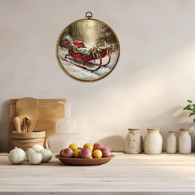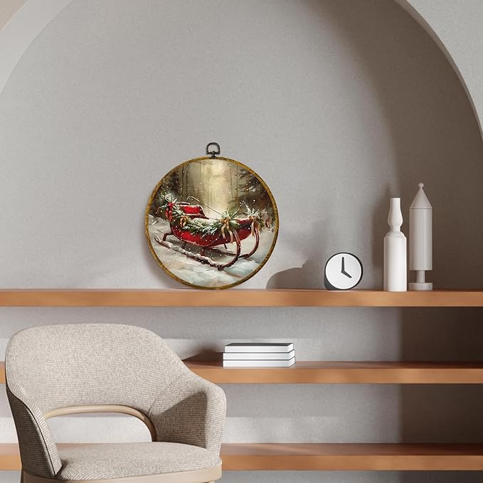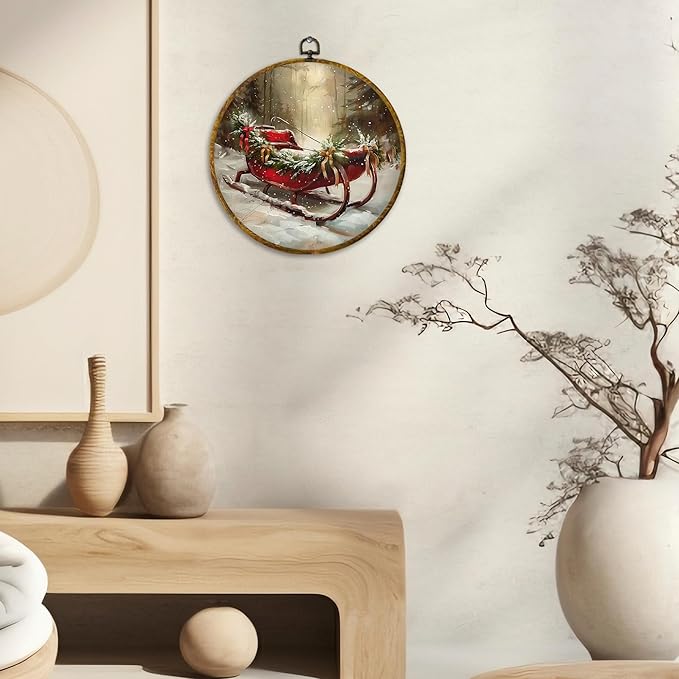 CUANFDDSF Vintage Christmas Sleigh Round Wall Art Decor, Rustic Farmhouse Winter Xmas Sleigh Holiday Wall Hanging Frame Decor, Cozy Christmas Canvas Prints Decorations for Home Bedroom, 10x10 Inch