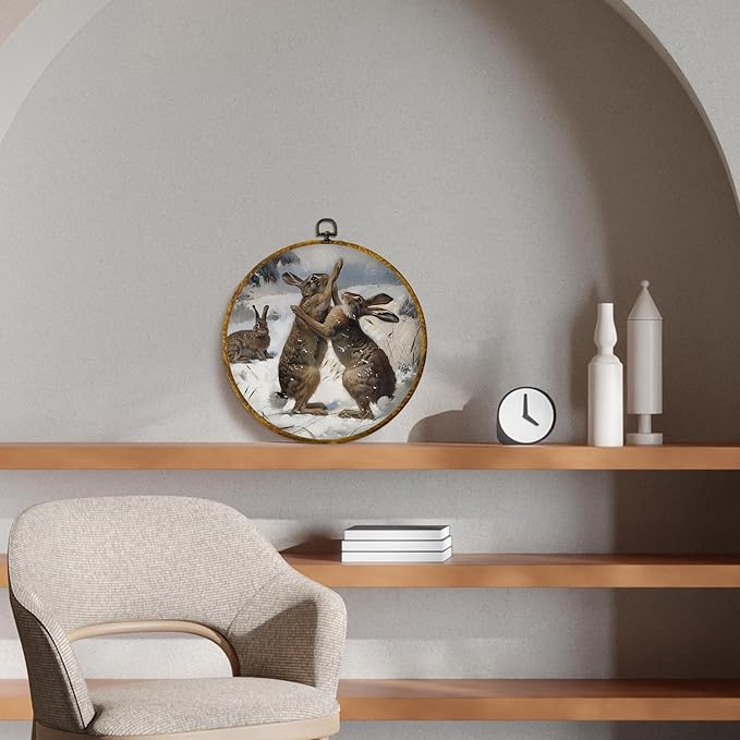 CUANFDDSF Vintage Winter Bunny Round Wall Art Decor, Rustic Cottagecore Rabbit Wall Hanging Frame Decor, Antique Winter Fighting Bunny Canvas Prints Decorations for Home Bedroom, 10x10 Inch