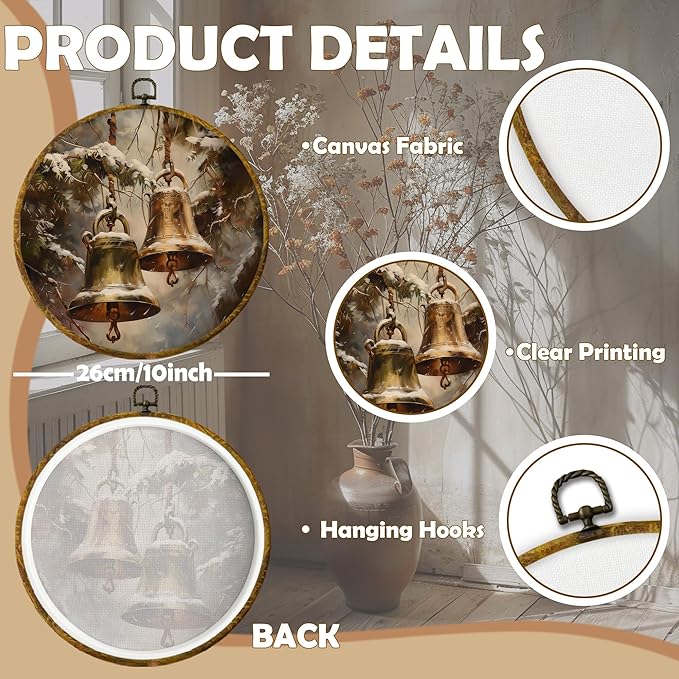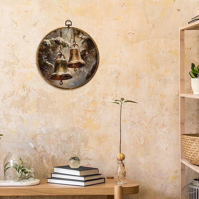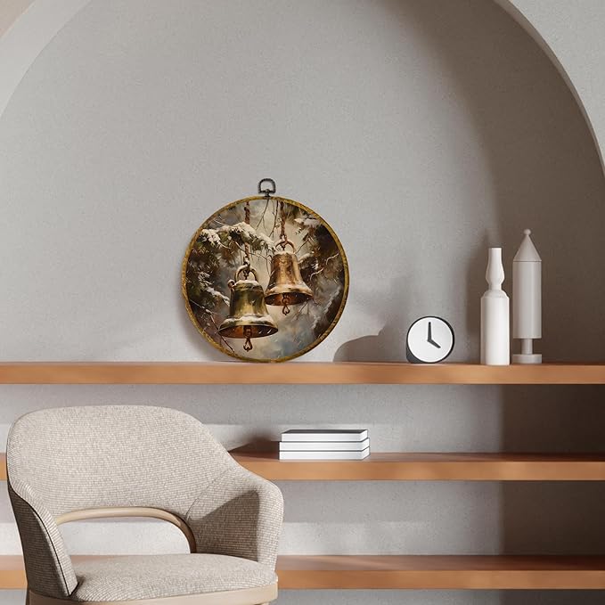 CUANFDDSF Vintage Winter Bells Round Wall Art Decor, Rustic Christmas Xmas Golden Bells Holiday Wall Hanging Frame Decor, Elegant Christmas Canvas Prints Decorations for Home Bedroom, 10x10 Inch