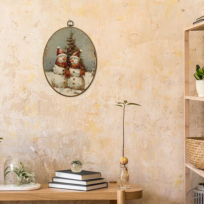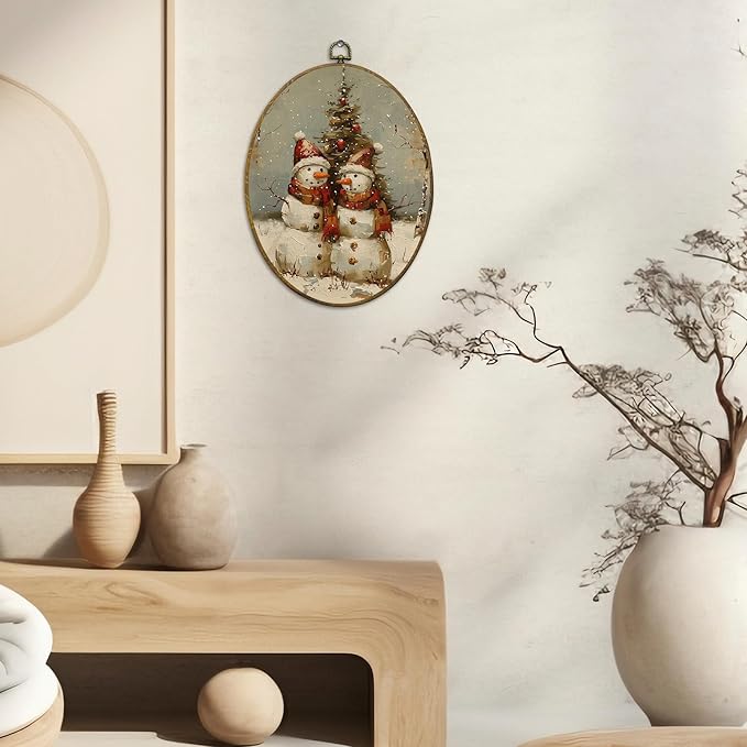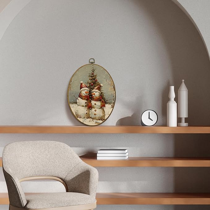 CUANFDDSF Vintage Christmas Snowman Oval Wall Art Decor, Farmhouse Rustic Winter Xmas Snowman Wall Hanging Decor, Retro Christmas Framed Canvas Prints for Home Bedroom Living Room, 8.6x11.4 Inch