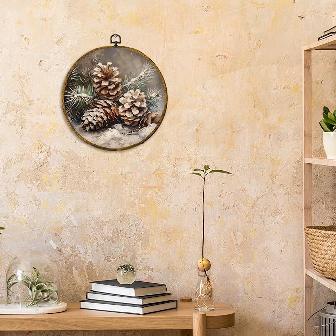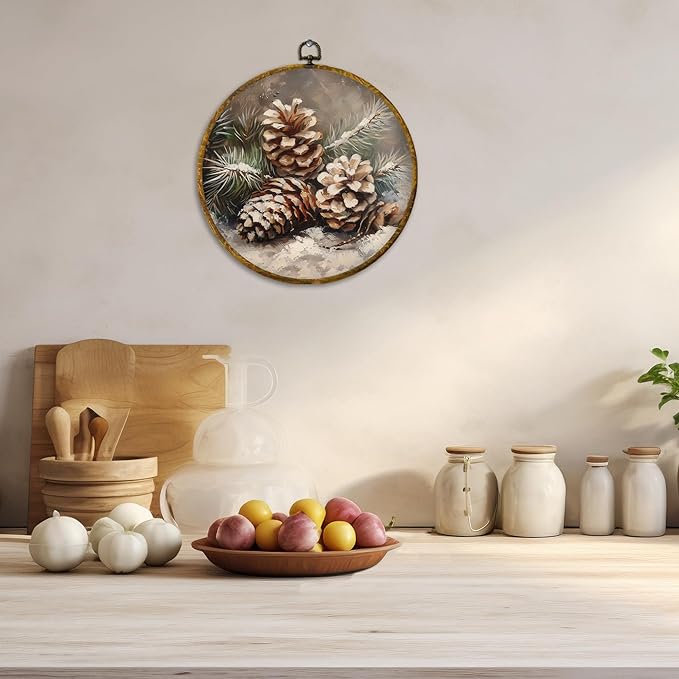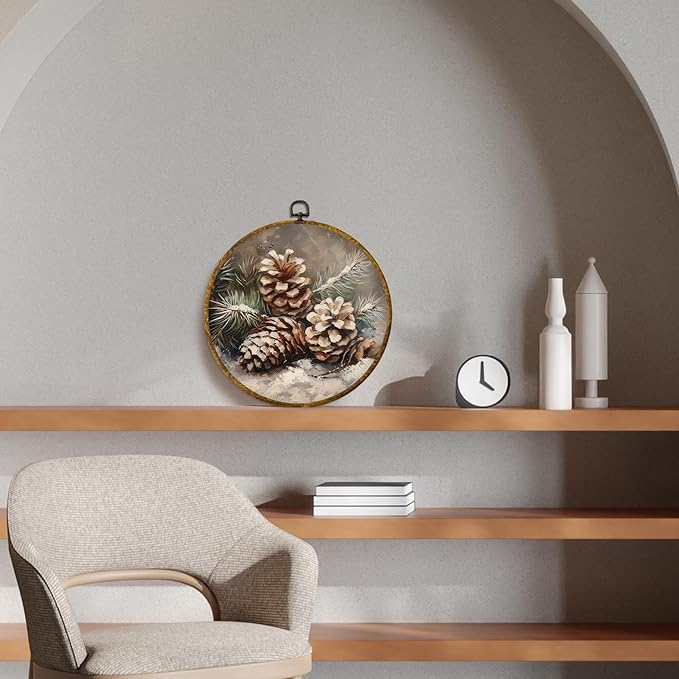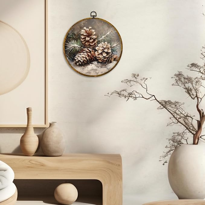 CUANFDDSF Vintage Christmas Winter Pinecones Round Wall Art Decor, Rustic Nature Pine Cone Wall Hanging Frame Decor, Farmhouse Christmas Winter Canvas Prints Decorations for Home Bedroom, 10x10 Inch